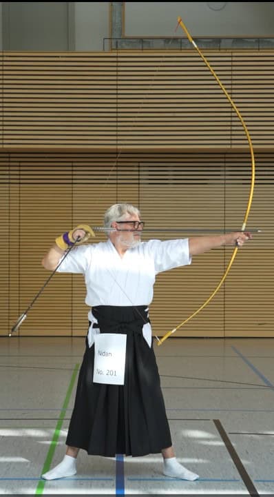 Für Kyudoka gibt es zwei Messlatten: Wettbewerbe und die Prüfungen durch Experten. Diese Prüfungen heißen „Shinsa“ und hier werden Graduierungen vergeben. Es gibt fünf Kyu-Grade, die vom fünften bis zum ersten Kyu reichen. Darüber hinaus gibt es die Dan-Grade, die beim ersten Dan starten. Der höchste derzeit an einen Deutschen vergebene Dan ist der 6. Dan. Bei 1343 Kyudoka in Deutschland gibt es nur fünf mit dem 6. Dan. Diese Sportler haben praktisch ein ganzes Sportlerleben lang Kyudo praktiziert. Ihr Schießen zu erleben ist ein optischer Hochgenuss und zeigt, wie vollkommen man Bogenschießen beherrschen kann.